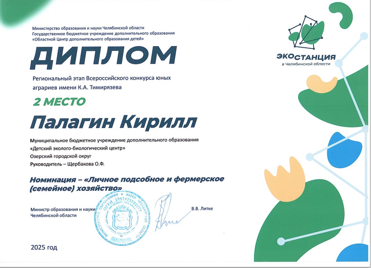 6 ноября мы получили диплом 2 степени от Министерства образования Челябинской области. Это результат регионального этапа Всероссийского конкурса юных аграриев имени К. А. Тимирязева, который состоялся 29 сентября.